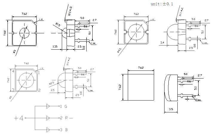 食人鱼led灯珠,是一种直插封装,型号有5mm圆头方形、3mm圆头方形、子弹头方形、面包型、平面方形的,透明树脂封装,四个引脚,负极处有个缺脚的LED。