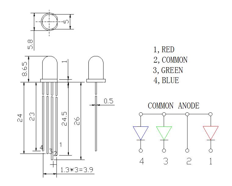 | 产品信息 | 产品形状描述:5mm圆形有帽沿全彩发光二极管 | ||||||